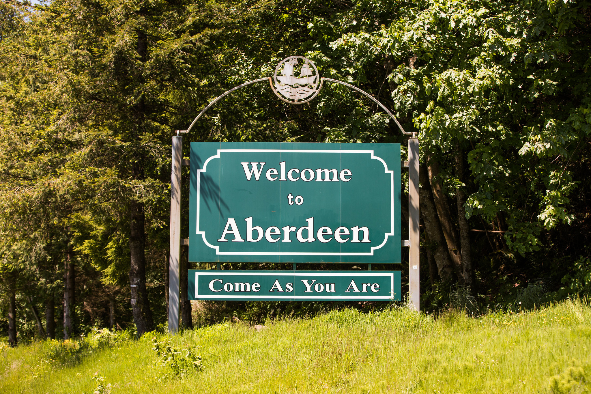 The large sign appears on the side of the highway as you round the last bend on the highway into Aberdeen, WA. It's a wholesome Brunswick green, the reassuring colour of governmental initiatives the world over. The lettering is bold and friendly, and the whole thing is topped with a cast-iron sailing ship sailing merrily into a cast-iron bay.